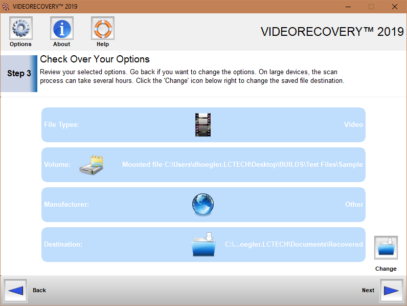 | 第3步: 运行扫描之前查看您的选择。这将确保您选择正确的设置,恢复您的数据。如果是不正确的的,点击“返回”按钮返回并更改选项。点击“更改”图标,选择一个恢复的数据被保存到不同的目的地文件夹。单击“下一步”开始扫描。 |